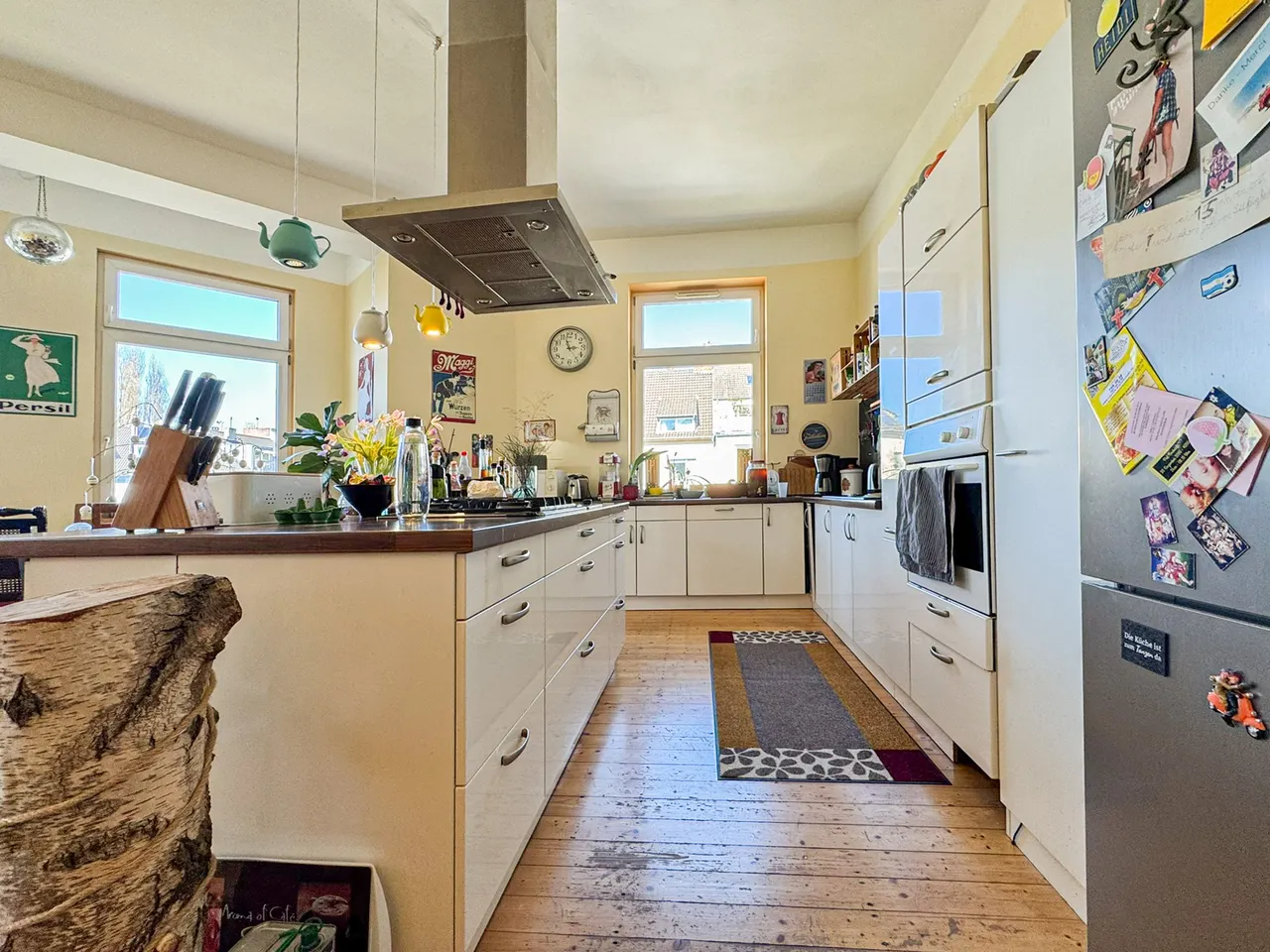 Beeindruckend sind die 3,40 m hohen Decken in Kombination mit den teilweise bodentiefen Fenstern, die täglich für Wohlbefinden sorgen und ein luftiges Raumkonzept erschaffen.