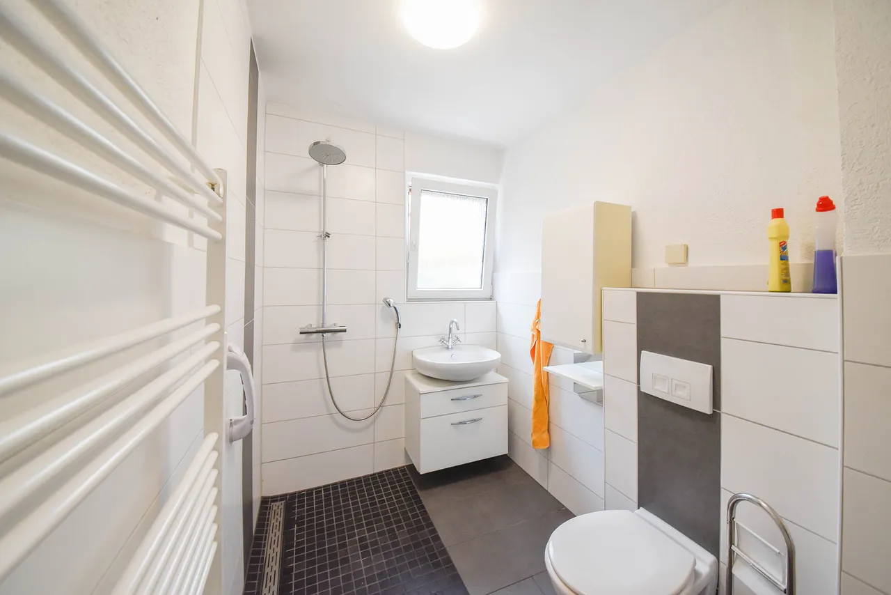 | Bad mit Dusche, Wanne, Fenster |