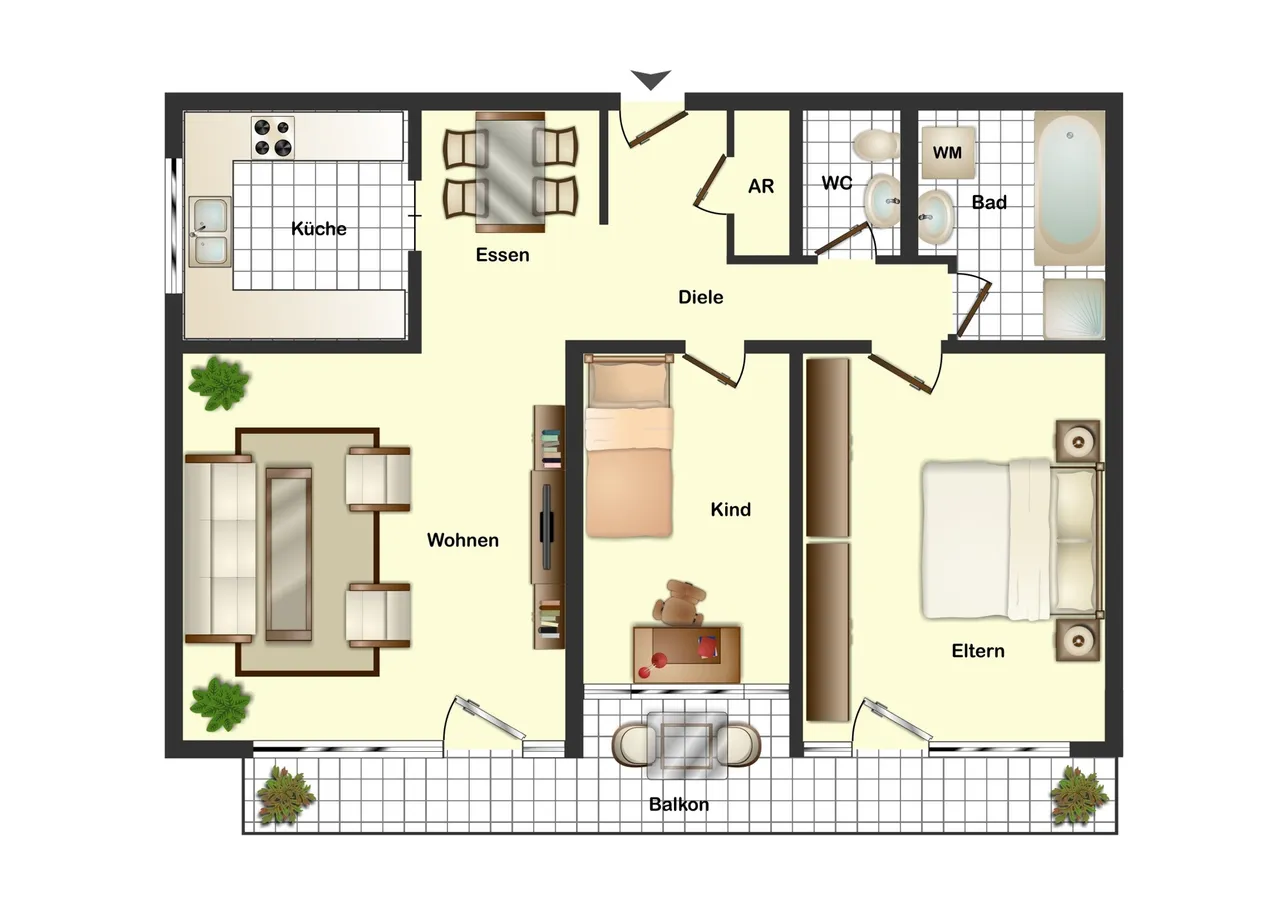 Mittelpunkt der Wohnung ist der offen gestaltete Wohn-/Koch-Essbereich. Zwei Schlafräume, ein baujahrtypisches Bad mit Dusche und Wanne sowie ein Gäste-WC komplettieren