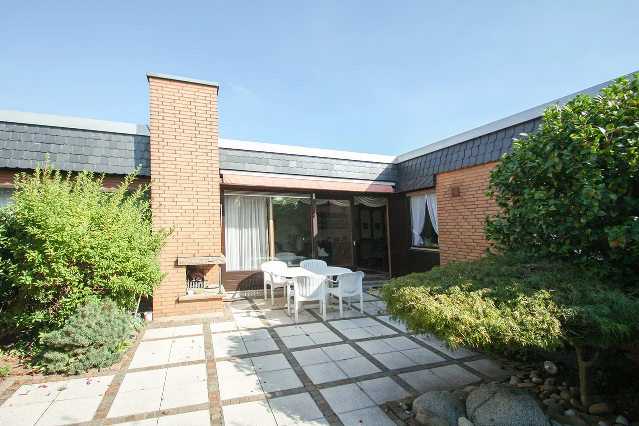 Der großzügige Winkelbungalow wurde von einem renommierten Bauträger errichtet und bietet neben 155 m² Wohnfläche noch einmal 120 m² Nutzfläche im Untergeschoss.
