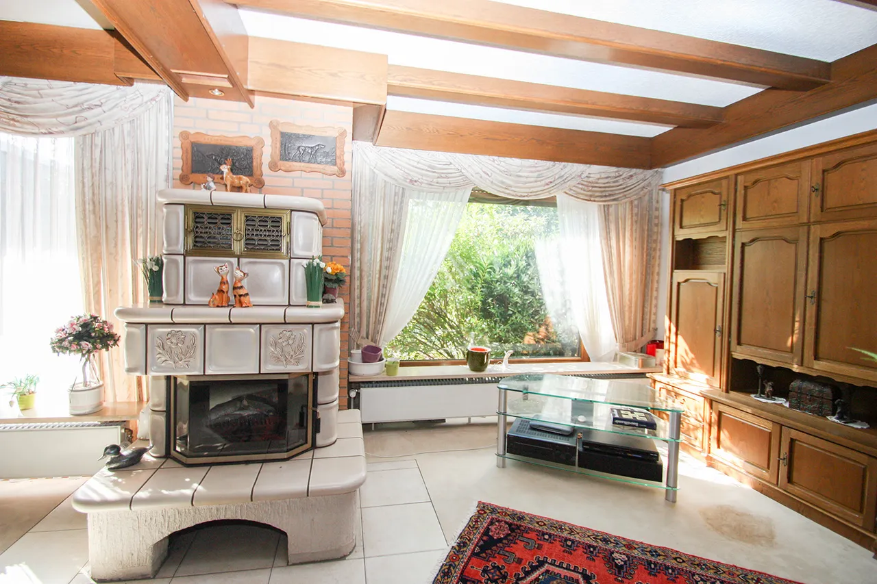 Der Wohnraum besticht durch seine Größe und die hochwertigen, vom Schreiner angefertigten Stilelemente. Der offene Kamin sorgt im