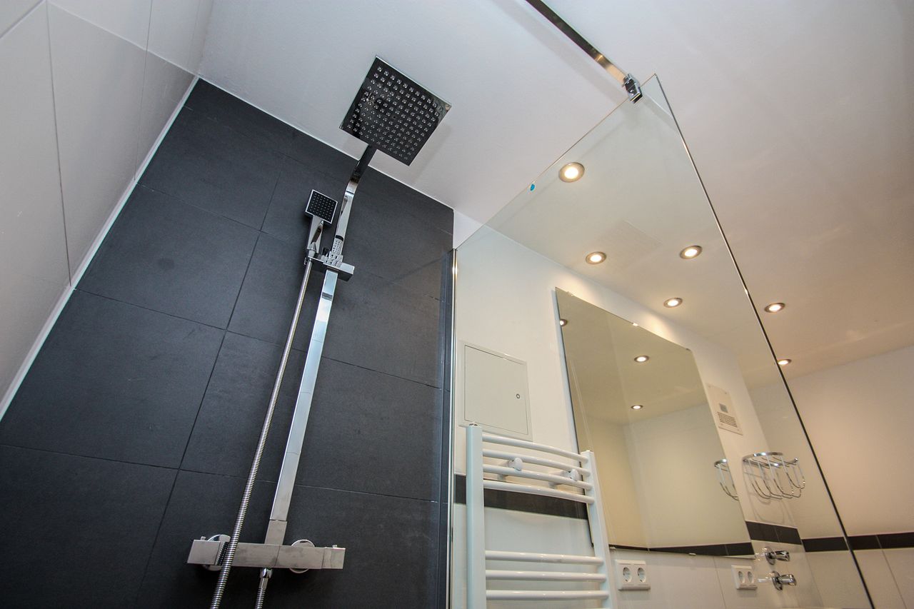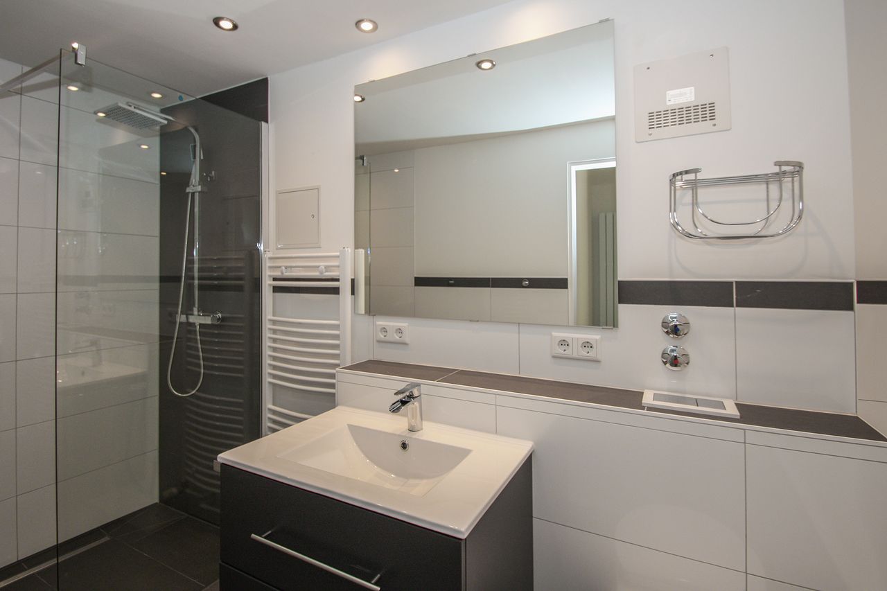 - kernsaniertes Bad mit begehbarer Glasdusche und Badewanne, elegant in schwarz-weiß mit modernsten Schwall-Armaturen