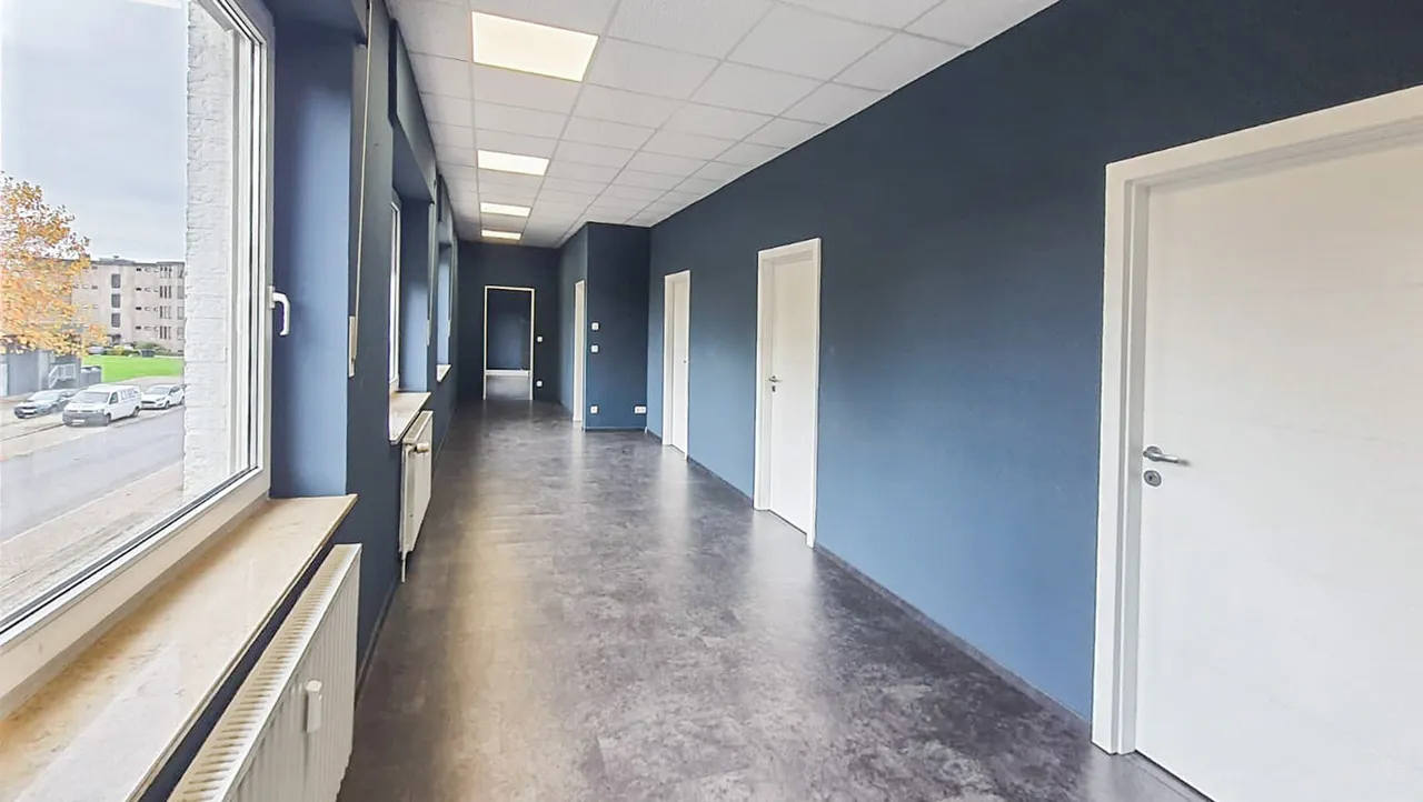 Der Gewerbekomplex befindet sich auf einem eingezäunten Areal und besteht aus einem dreigeschossigen Bürogebäude mit angrenzender Halle.