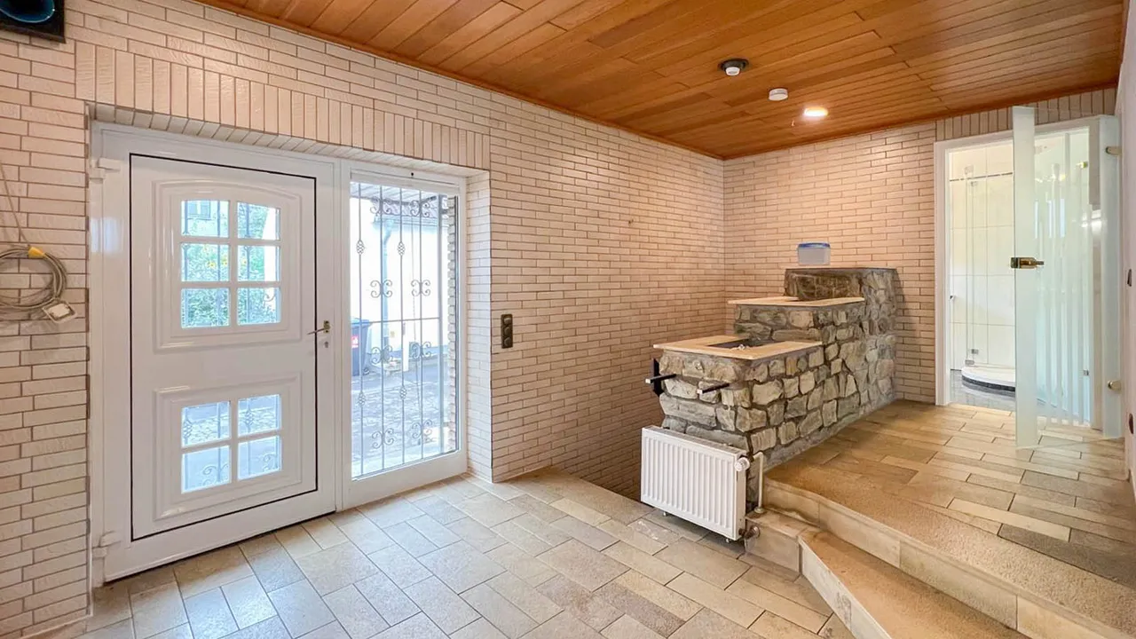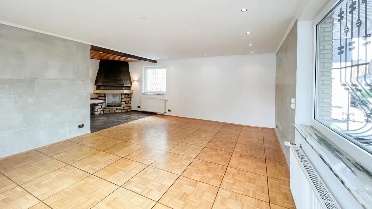 Das Highlight ist der großzügige Wohnbereich mit Halogenspots und gemütlicher Kaminecke.