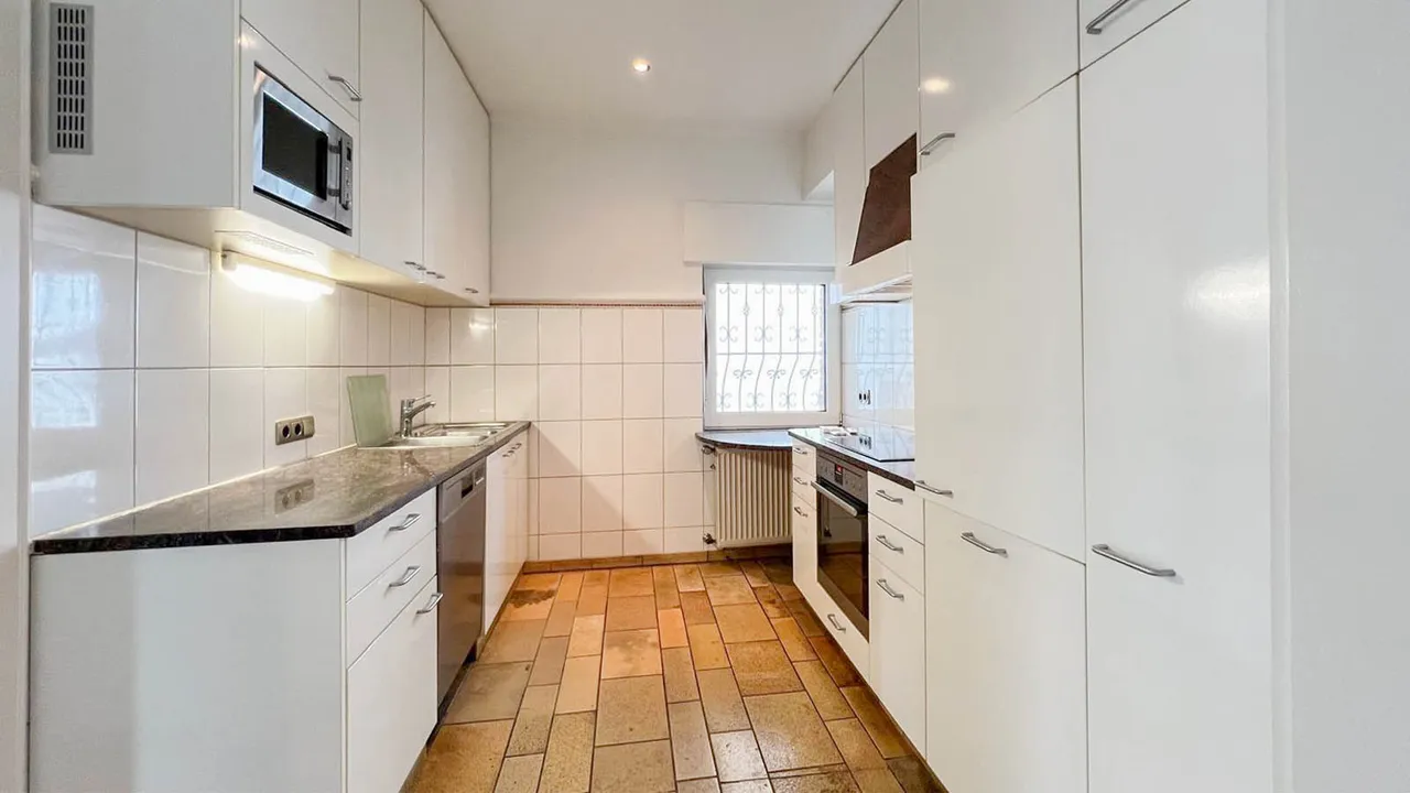 Die nebenan gelegene Einbauküche mit hochwertigen AEG-Elektrogeräten kann optional mit übernommen werden. Schlafraum,